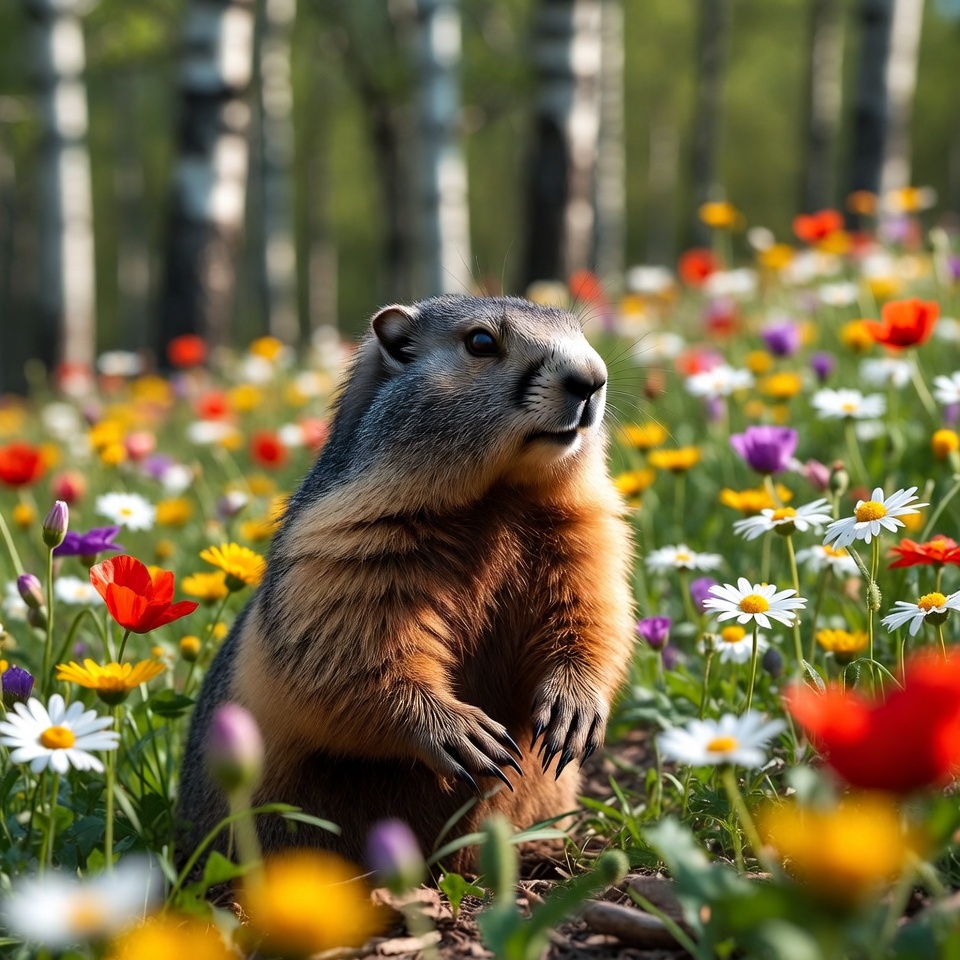 A marmot stands among colorful flowers in a sunny field. The bright blooms surround the animal in a vibrant scene of nature.
