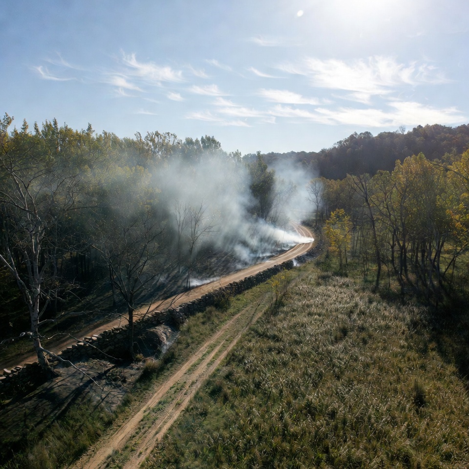 Smoke billows from a dirt road surrounded by trees during the day. Sunlight shines down on the landscape filled with grass.
