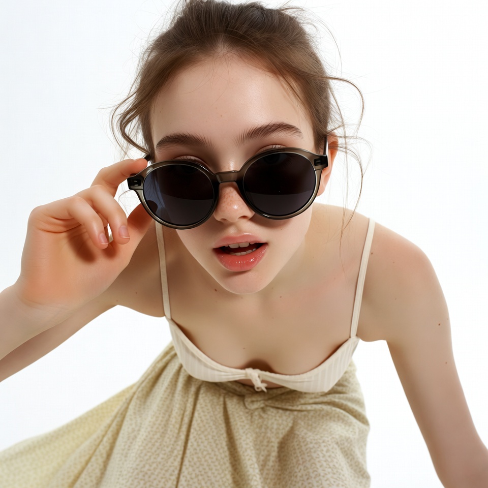 A young woman is adjusting her sunglasses while looking at the camera. She is wearing a light dress with a simple design and appears focused.