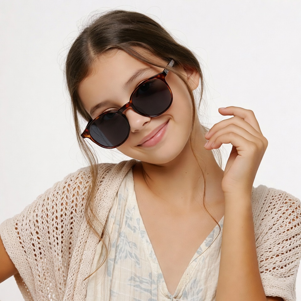 A girl poses with sunglasses, smiling at the camera indoors. She has long hair and is dressed in a light outfit.