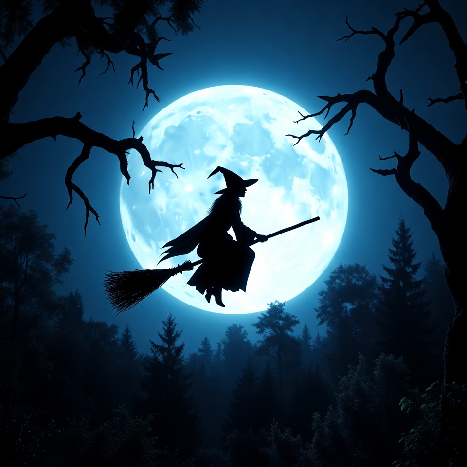 A witch rides her broomstick across the night sky. The full moon shines brightly above dark trees. It is a spooky scene, capturing magic.