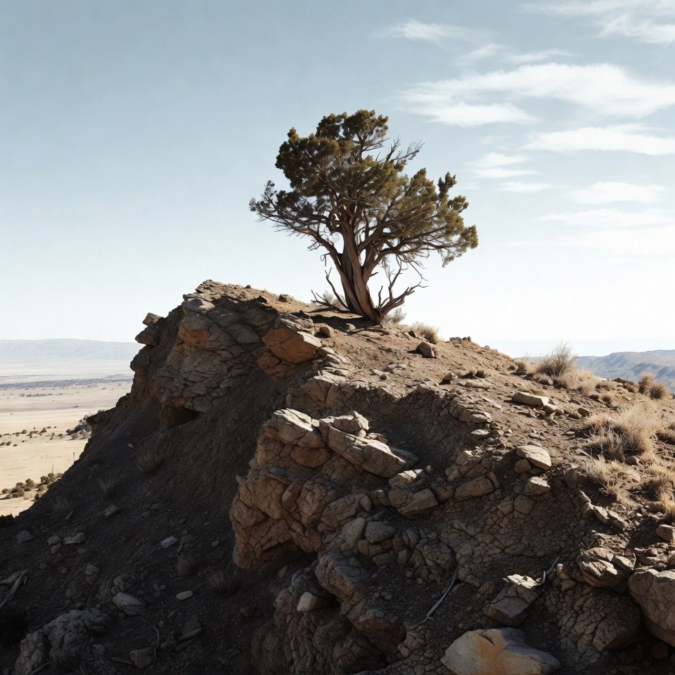 A tree stands alone on a rocky hilltop in a dry landscape during daytime. The sun shines brightly giving a clear view of the surroundings.