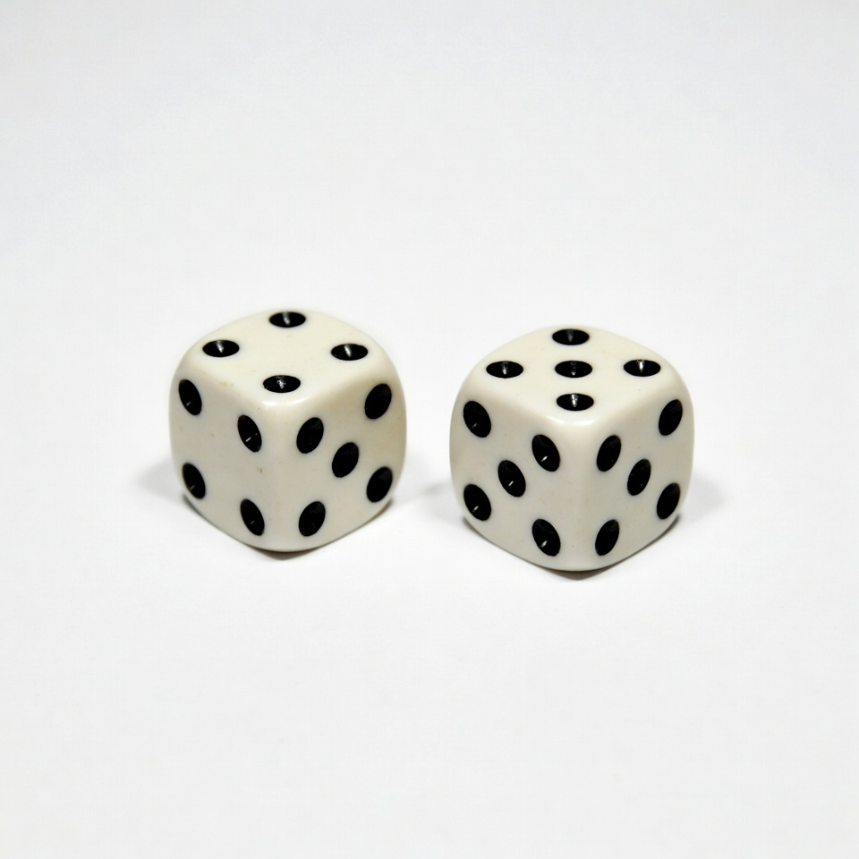 Two dice with black dots sit on a white surface, ready for a game or a chance. The numbers show various totals for play.