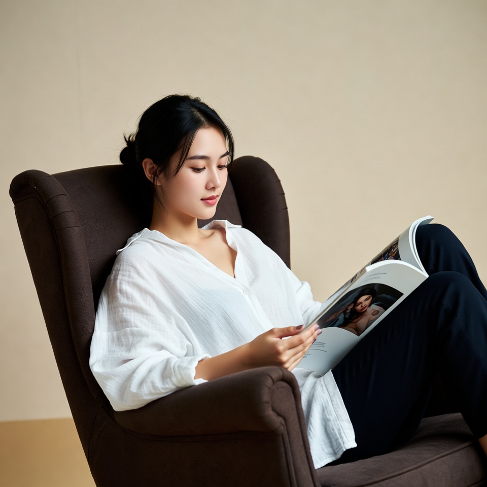 A woman sits in a chair, reading a magazine quietly, wearing a white shirt and dark pants. The setting is indoors with neutral colors.