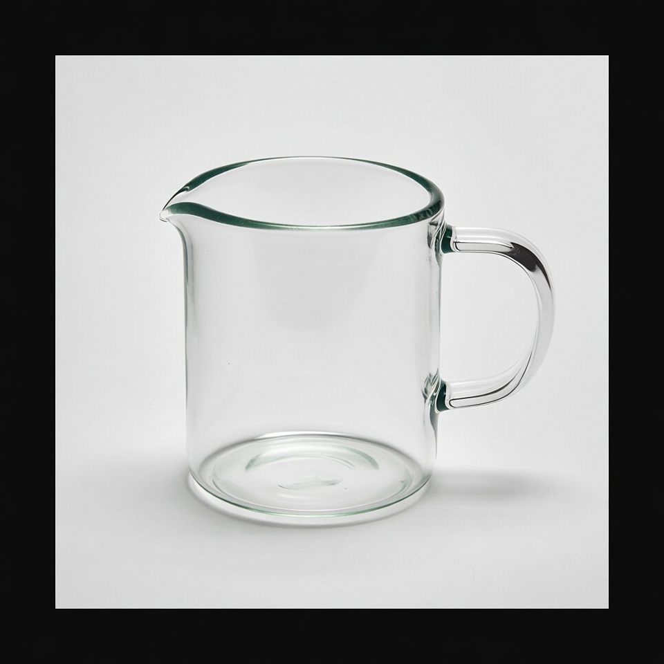 A clear glass measuring jug is placed on a plain background. It has a rounded body and a handle on the side for easy pouring.