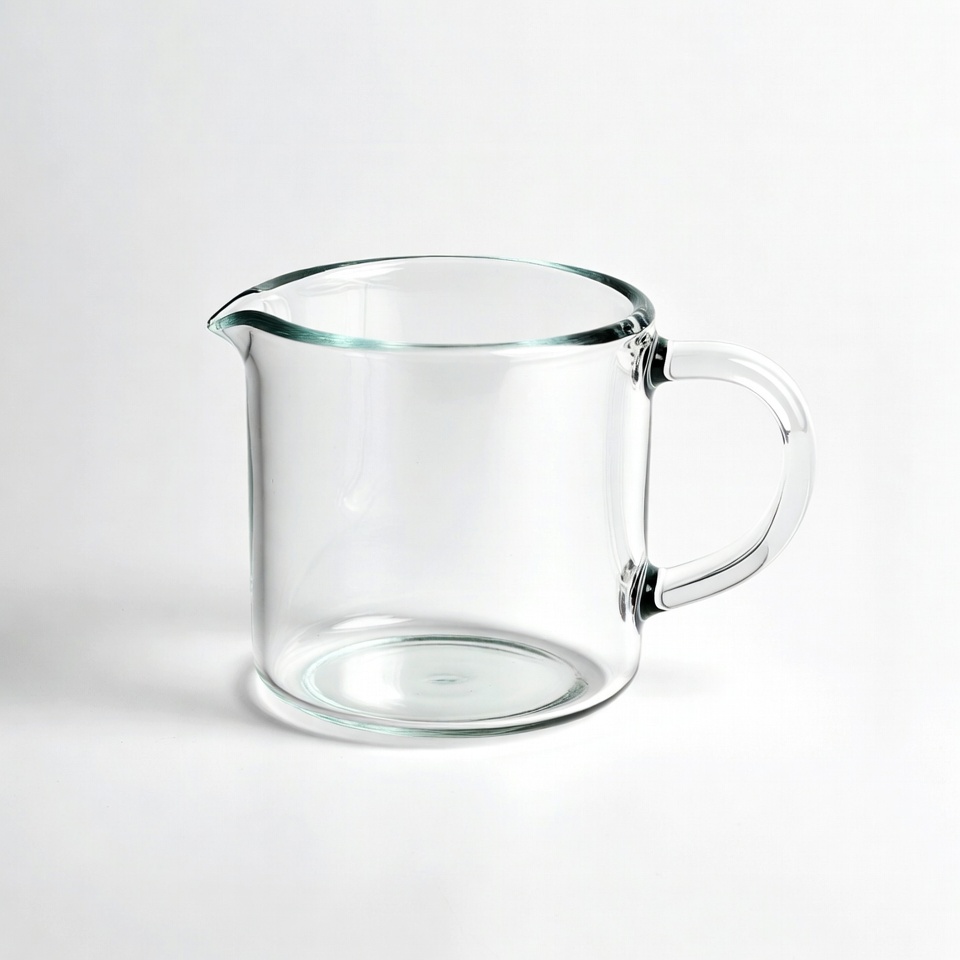 A clear glass measuring cup is placed on a white surface. The cup has a handle and a spout. It shows no markings.