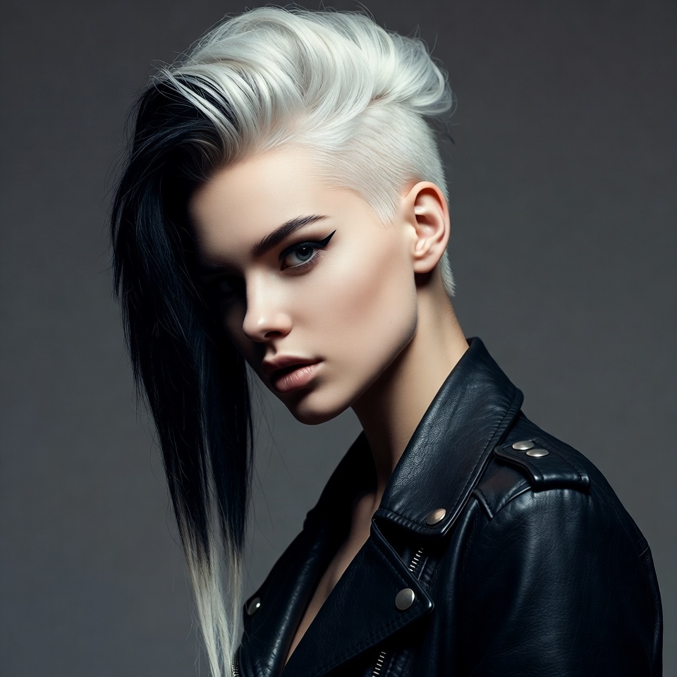 A person stands with a modern hairstyle featuring a mix of white and black hair. They wear a black leather jacket.