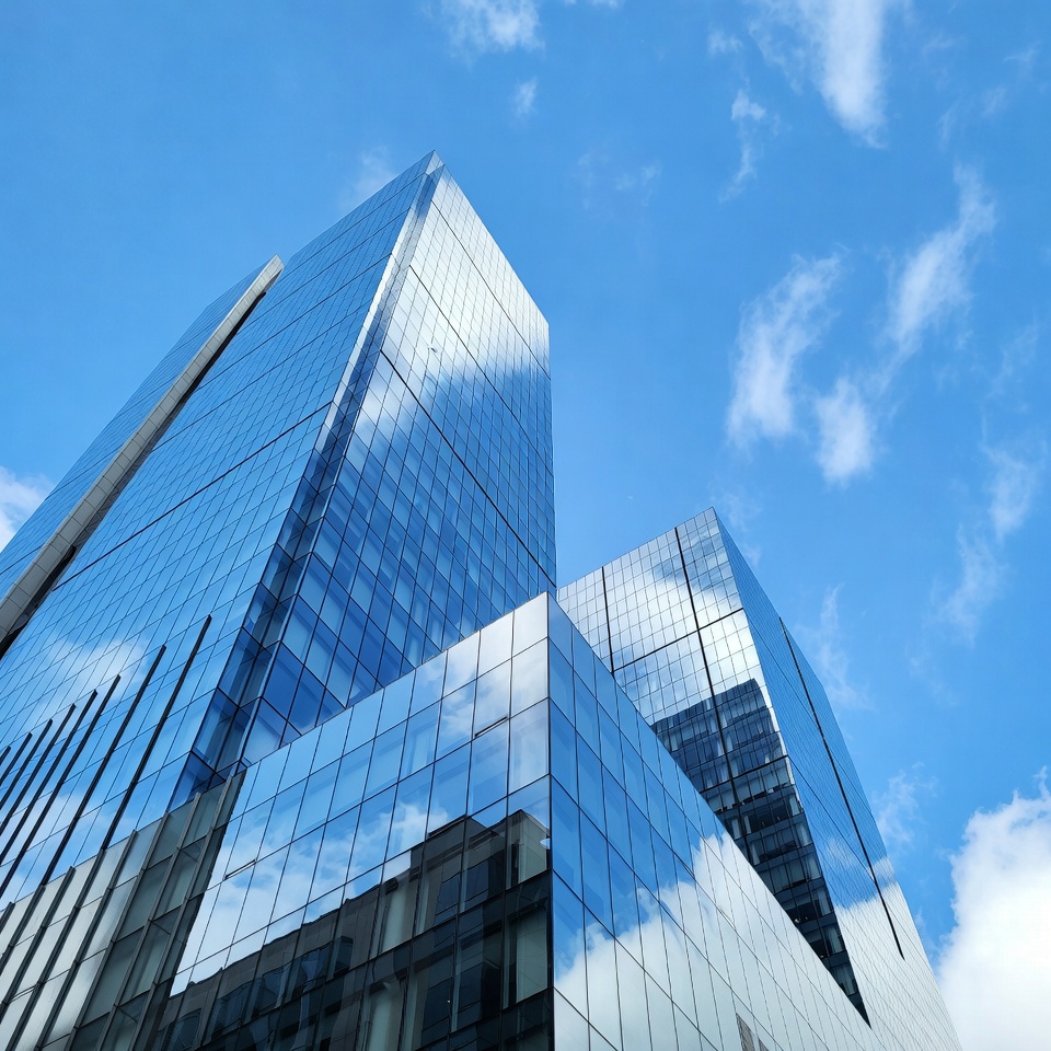Tall glass buildings reflect clouds and blue sky in a city. The structures show a mix of angles and surfaces. It's clear and bright.