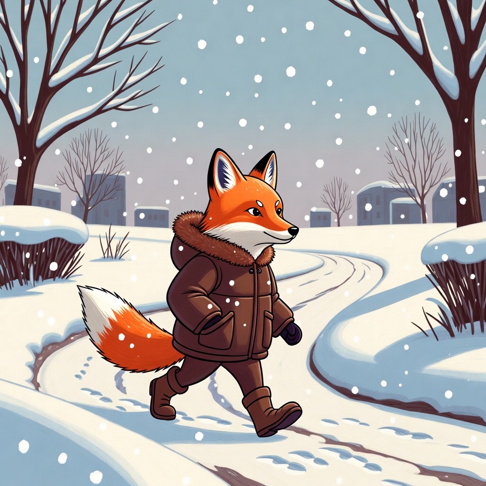 animal, boots, cartoon, coat, cold, fox, fur, gloves, illustration, nature, outdoor, path, scenery, season, snow, snowflakes, trees, walking, winter, woods