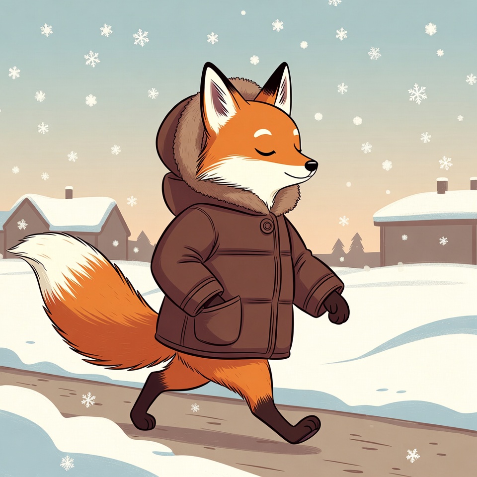animal, cartoon, character, coat, cold, evening, fox, fur, houses, nature, outdoors, path, playful, scene, scenery, season, snow, snowflakes, walking, winter