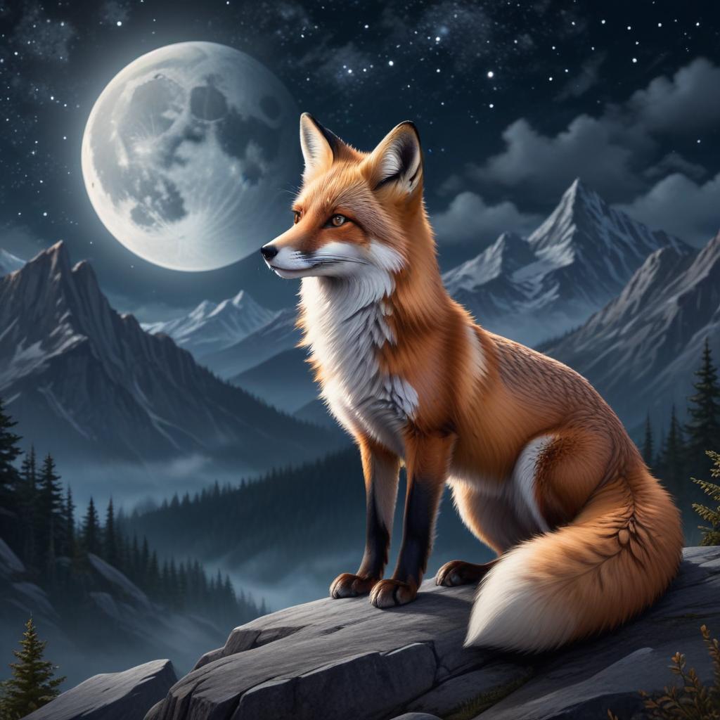 A fox is sitting on a rock with a full moon shining above. Mountains and trees surround the fox, creating a natural scene at night.