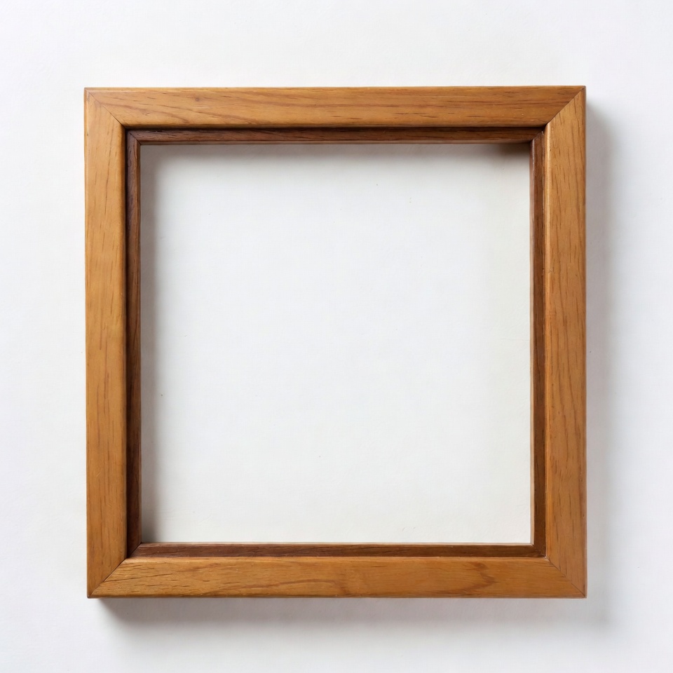 A simple wooden frame sits against a white wall. The frame is empty and ready for a picture or artwork.