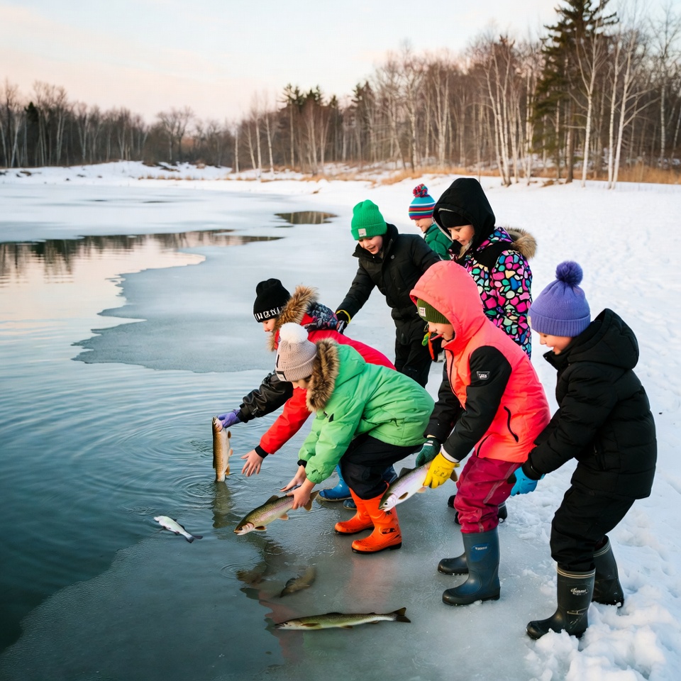 children, cold, environment, exploring, family, fishing, fun, game, ice, kids, leisure, nature, outdoor activity, play, river, snow, teamwork, water, wildlife, winter