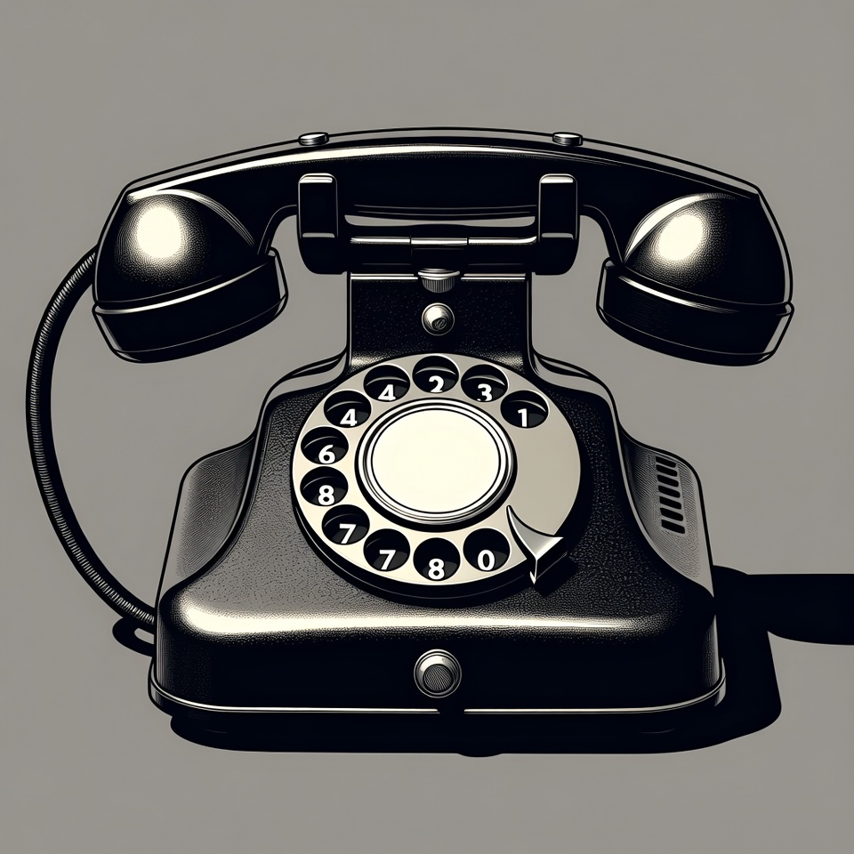 A black rotary phone sits on a gray background under soft lighting. The phone has a circular dial and two receivers.