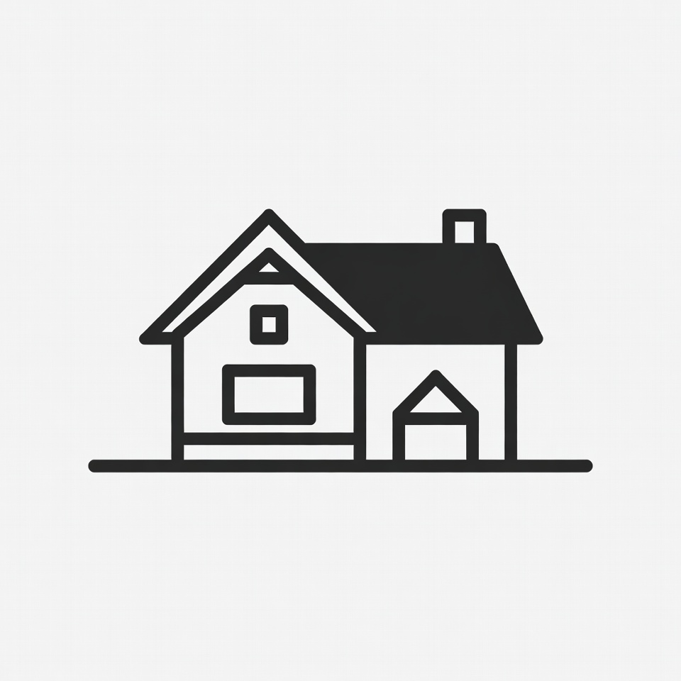 A black outline of a house shows details like windows, a door, and a chimney. The house stands with a base below it.