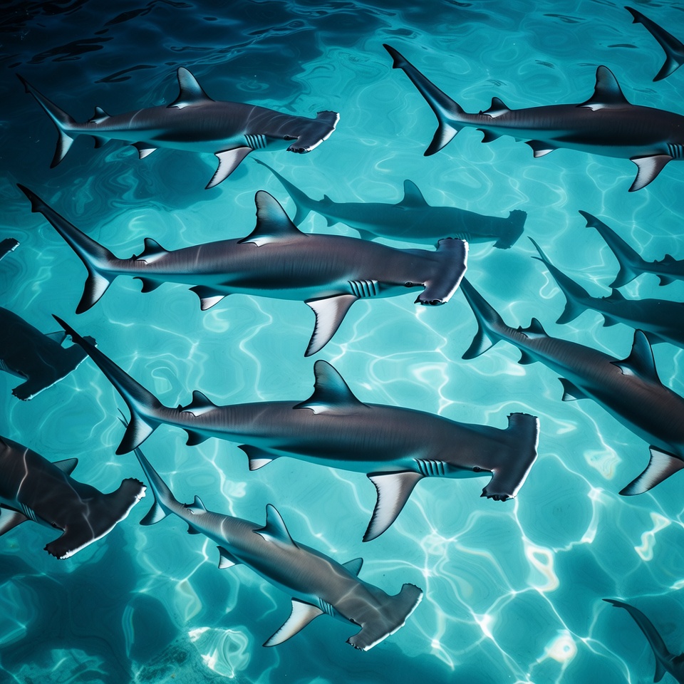 Groups of hammerhead sharks swim in clear, blue water. Sunlight reflects off the surface as they move gracefully.