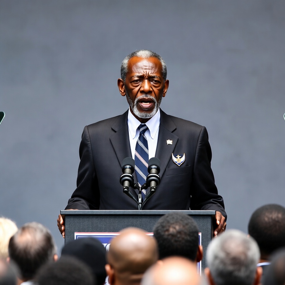An older man stands at a podium, speaking to a crowd in a formal setting. He wears a suit and appears serious while delivering his message.