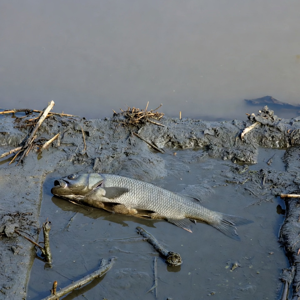 animal, dead fish, decay, drainage, ecosystem, environment, fish, freshwater, habitat, landscape, mud, muddy water, nature, pollution, river, river bank, scene, twigs, water, wildlife