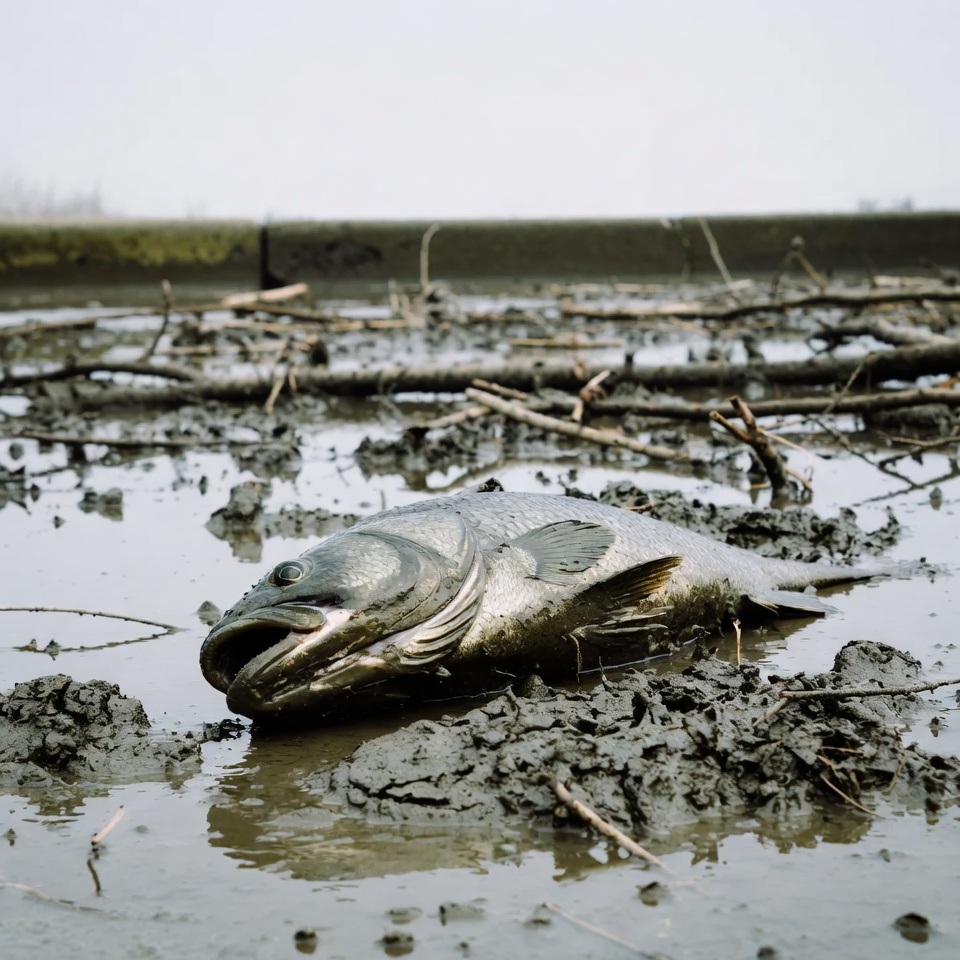 animals, content, debris, decay, dry ground, ecosystem, environment, fish, fish mortality, freshwater, habitat, landscape, muddy water, nature, overcast, pollution, riverbank, sticks, water quality, wildlife