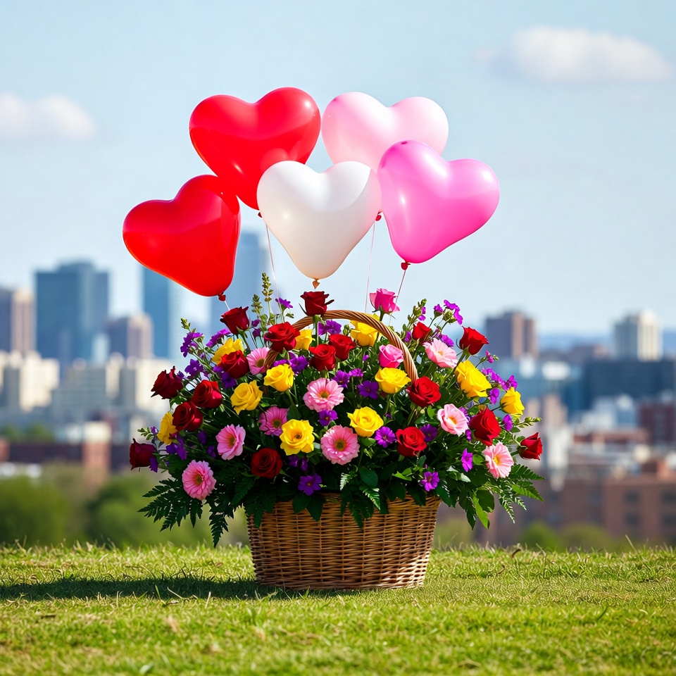 A basket filled with flowers and heart-shaped balloons stands on green grass. City buildings appear in the background under a clear sky.