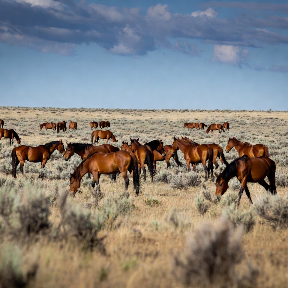 animals, clouds, dry grass, environment, equine, field, freedom, grazing, herd, horses, landscape, nature, open space, outdoors, plains, ranch, sky, terrain, western, wildlife