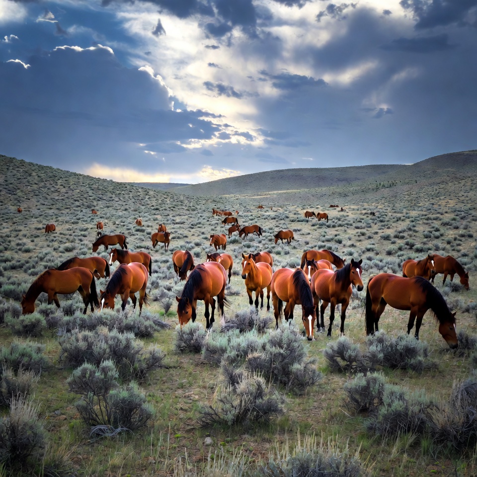 animals, bushes, clouds, earth, field, freedom, grass, grazing, herd, hills, horses, landscape, nature, outdoors, ranch, sky, summer, sunlight, terrain, wildlife