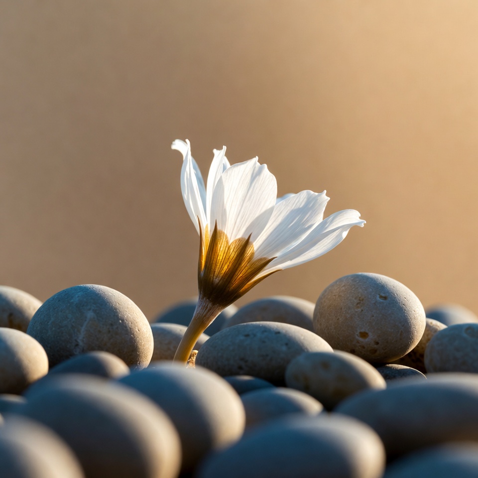 A flower stands tall among smooth stones under soft light. The scene focuses on the contrast between the flower and the stones.