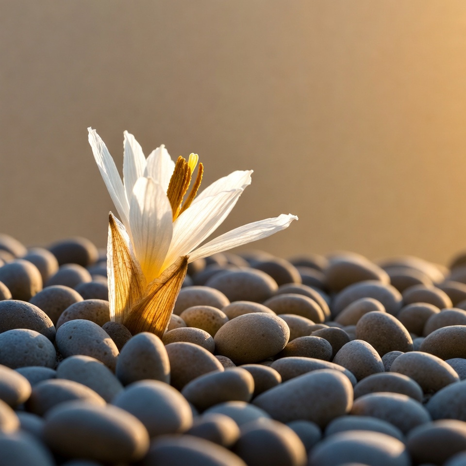 A single flower rises from a bed of smooth stones under soft sunlight, showcasing nature's resilience in a simple environment.