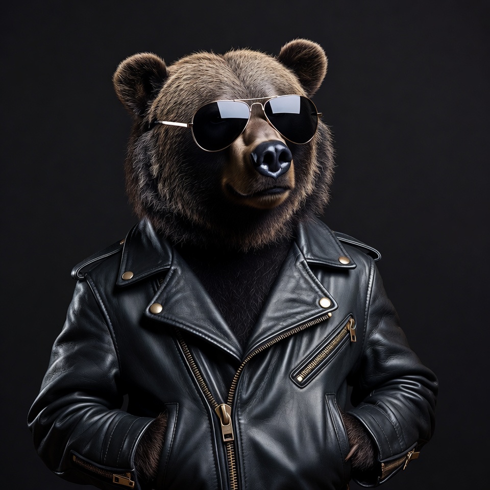 accessories, animal, anthropomorphism, bear, black, character, confidence, cool, coolness, dark background, fashion, fur, leather jacket, playful, portrait, pose, stylish, sunglasses, unique, wildlife