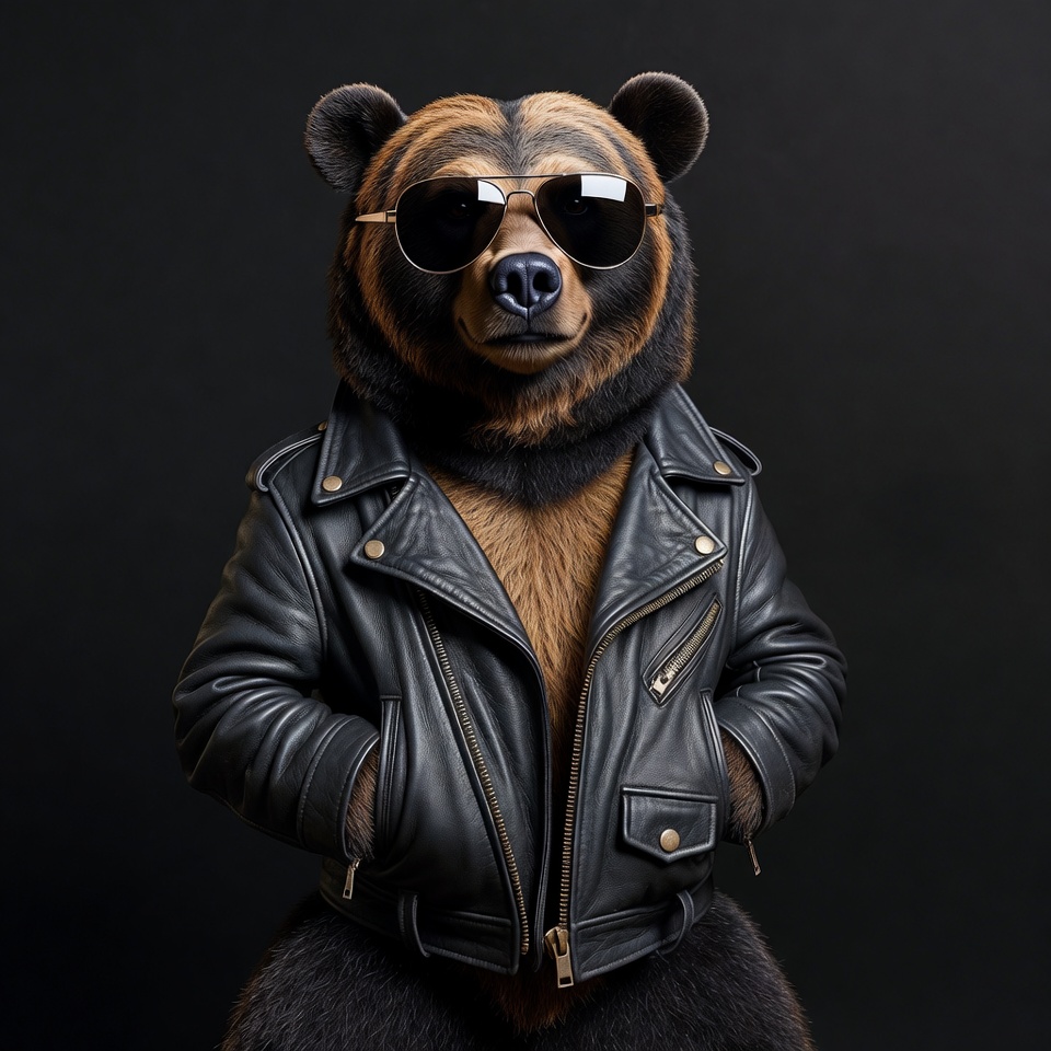 Bear in sunglasses wears leather jacket