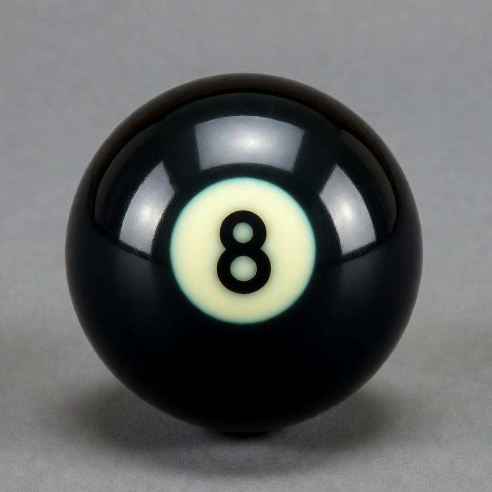 A black eight ball rests on a gray surface. The ball features the number eight inside a white circle.