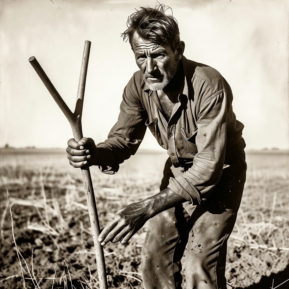 A farmer stands in a dry field, using a stick to check the soil. The sun shines down as he plants seeds in the ground.