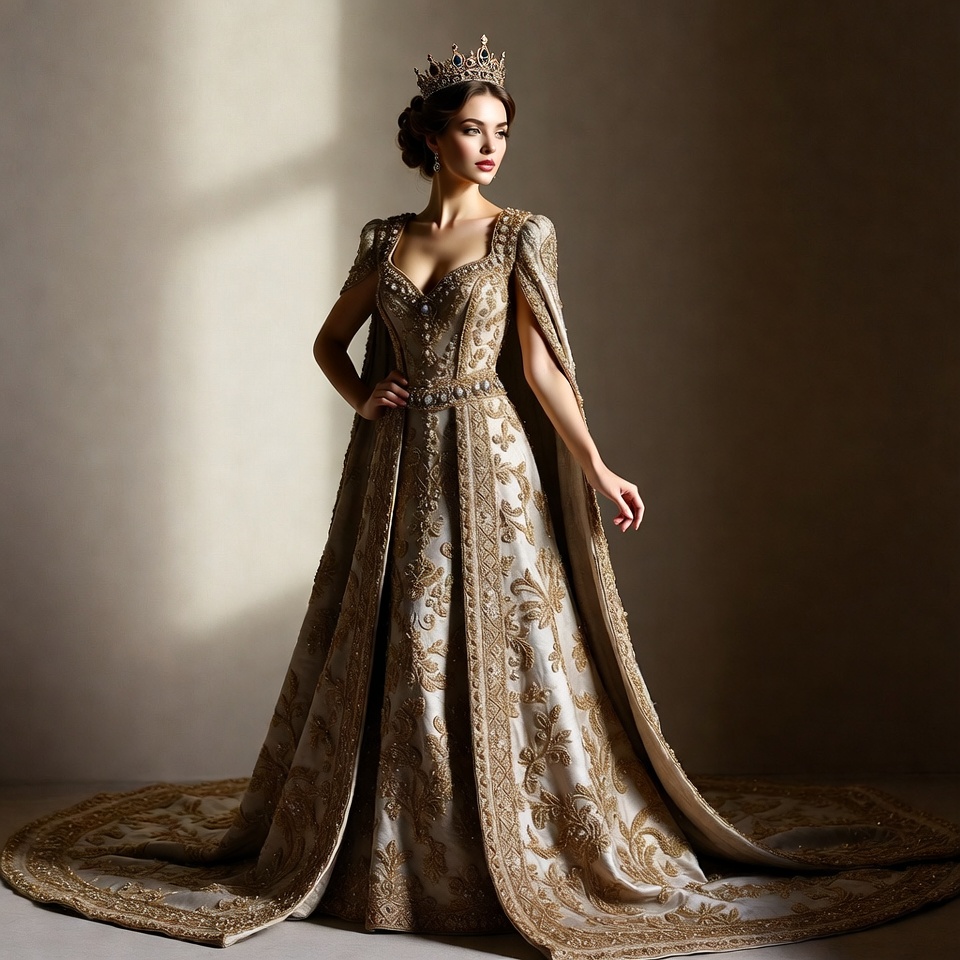 A woman stands in a studio wearing a detailed gown and crown. The gown features intricate designs and a long train.