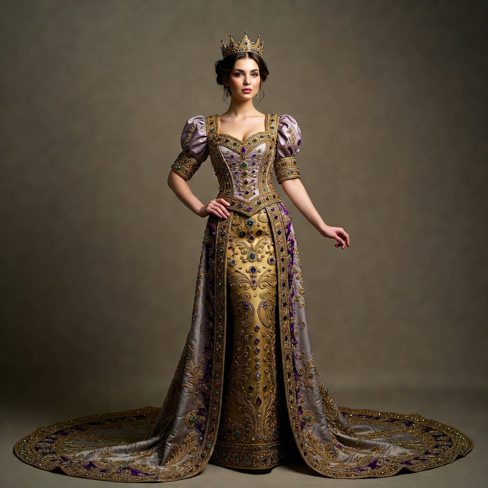 A woman stands wearing a detailed gown with a long train and a crown. She poses in a studio with a neutral background.