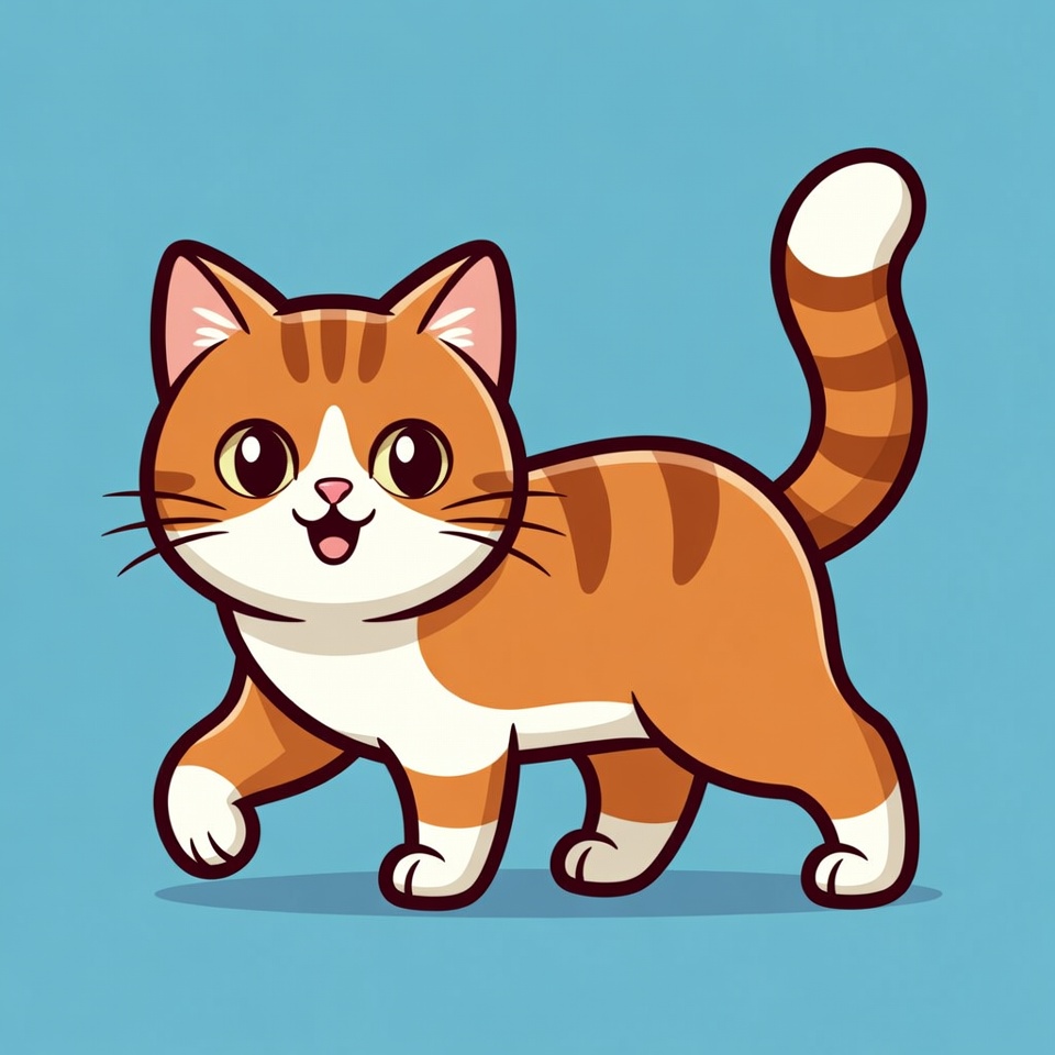 A small orange cat with white markings walks with a happy expression. The background is light blue, creating a vibrant scene.