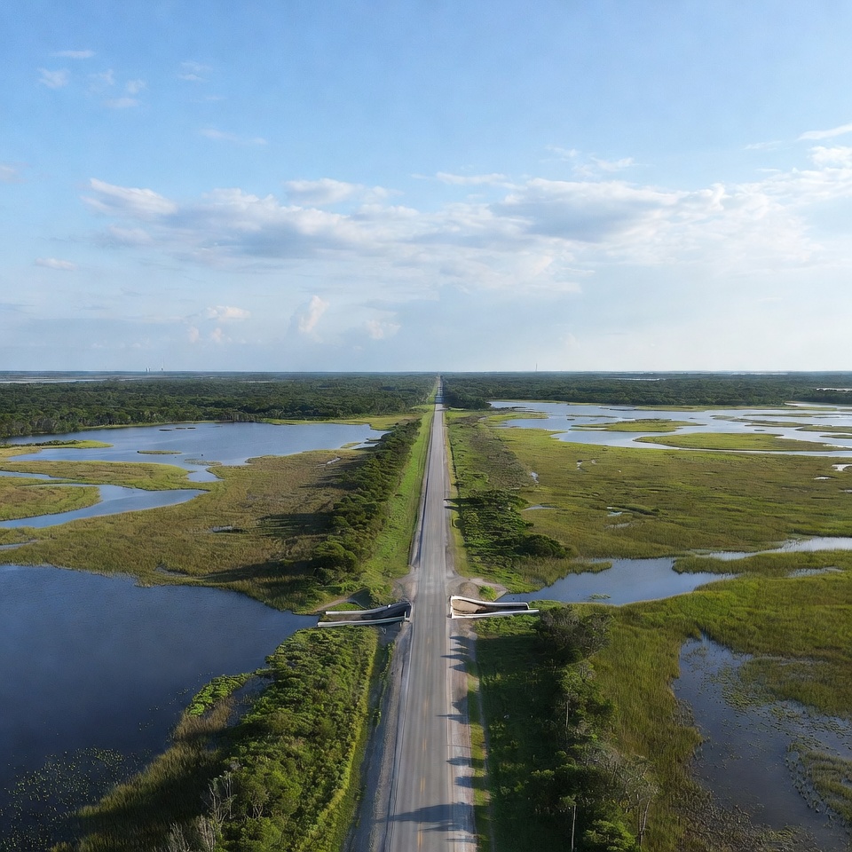 A long road stretches through a wetland area surrounded by water and grass. The sky is clear and bright, indicating daytime.