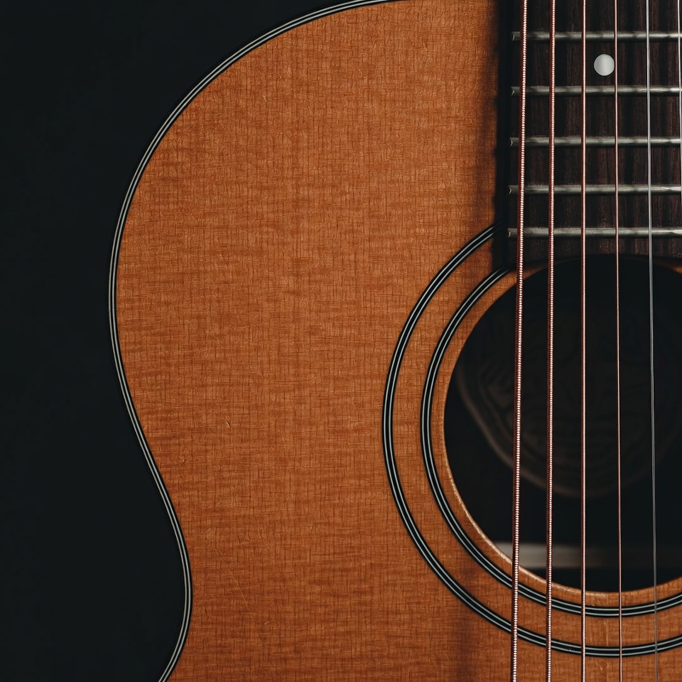 A close view shows the body and strings of an acoustic guitar. The warm wood tones stand out against a dark background, highlighting its design.