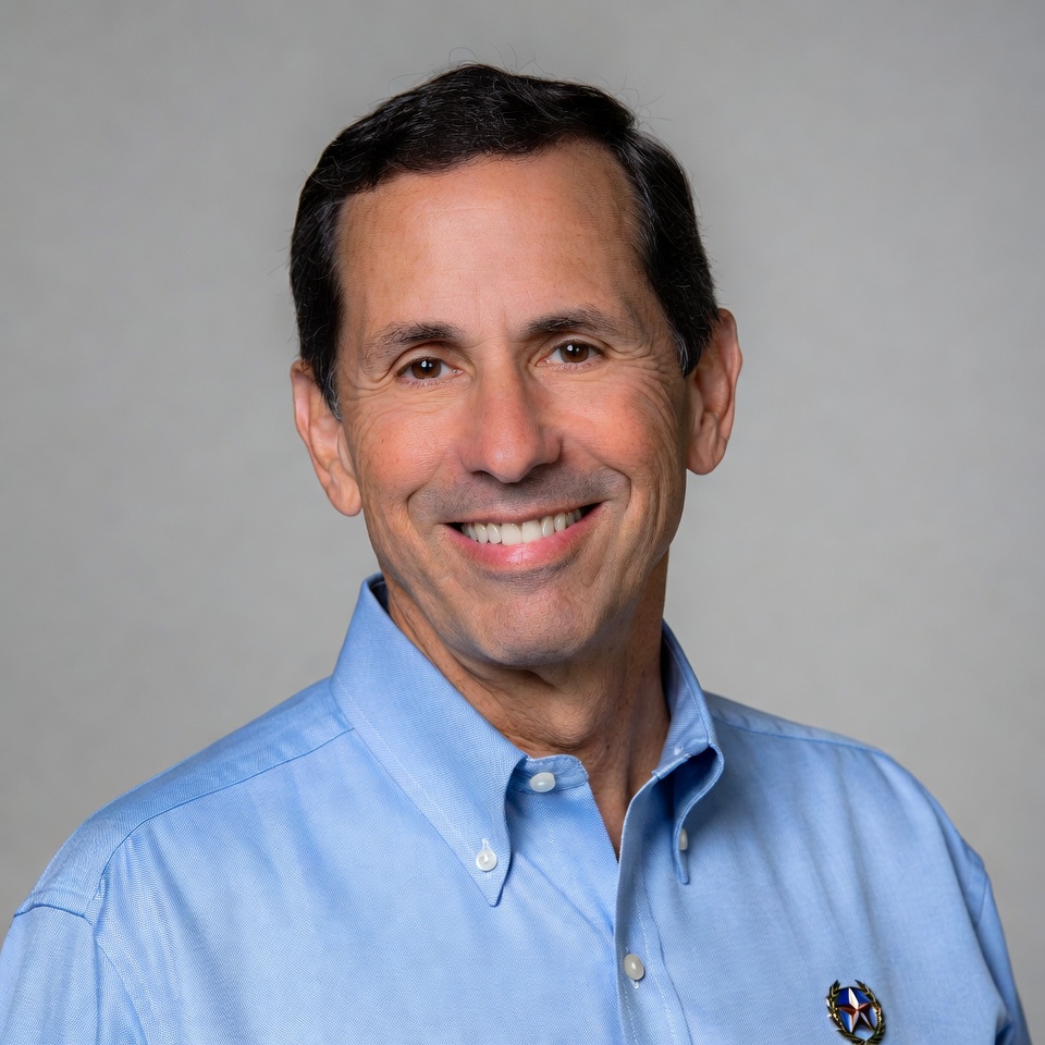 A man smiles while wearing a blue shirt. He stands against a light background in an indoor setting.