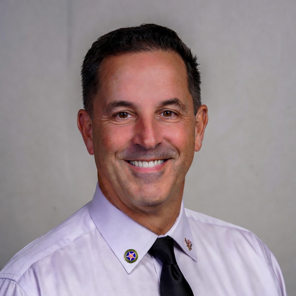 Man smiles while wearing a formal shirt and tie. He has short hair and is posing for a portrait in front of a simple background.