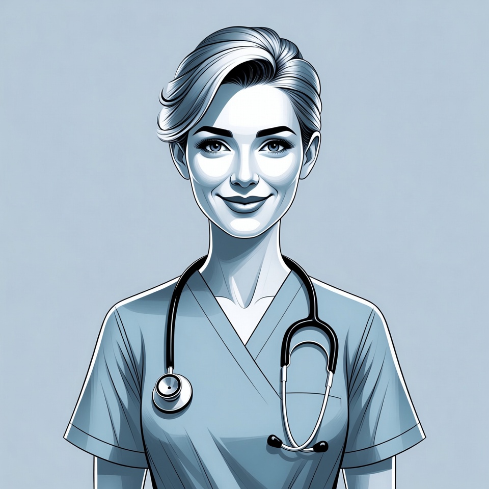 A health worker stands facing the viewer wearing scrubs and a stethoscope around the neck, ready to assist patients in a medical setting.