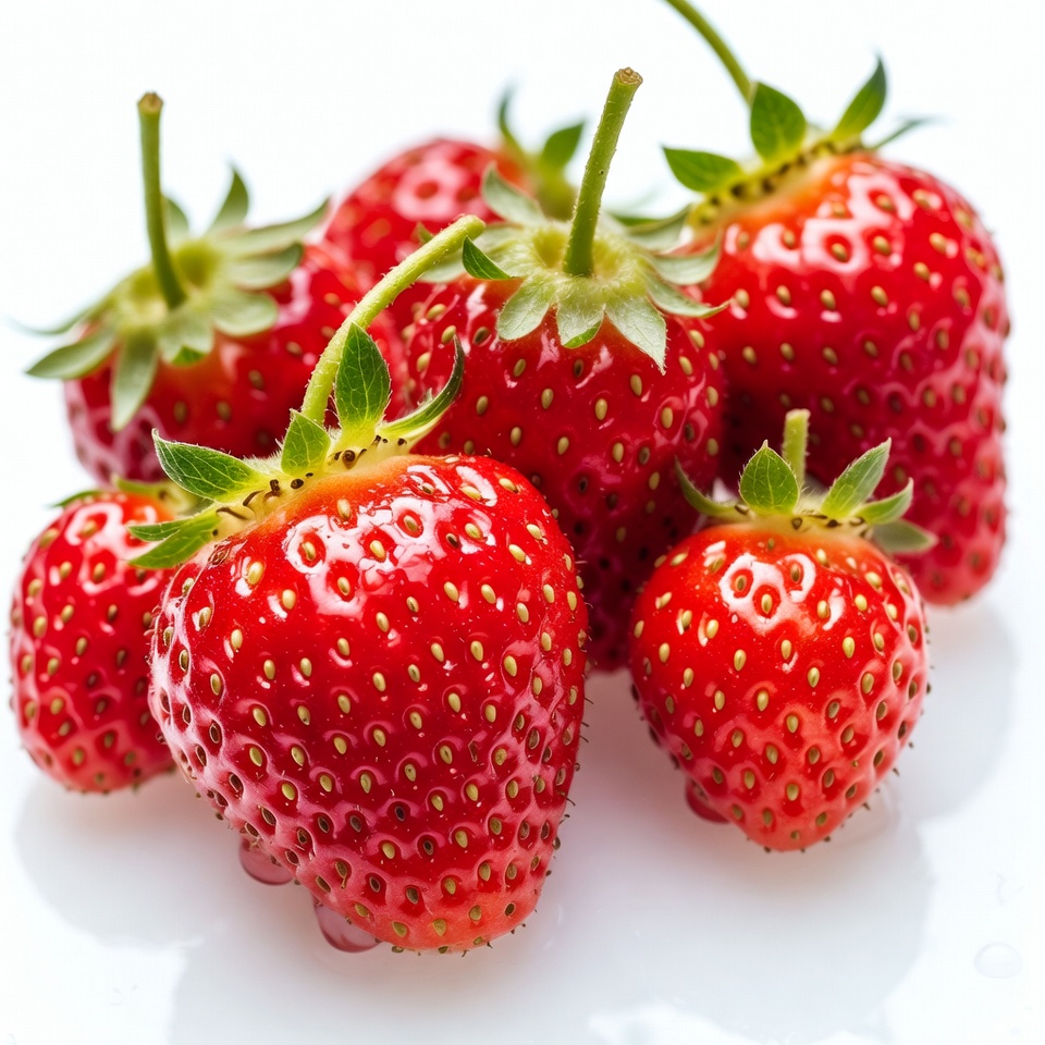 Six bright red strawberries rest on a white surface, showcasing their green leaves and seeds. Some berries are larger than others.
