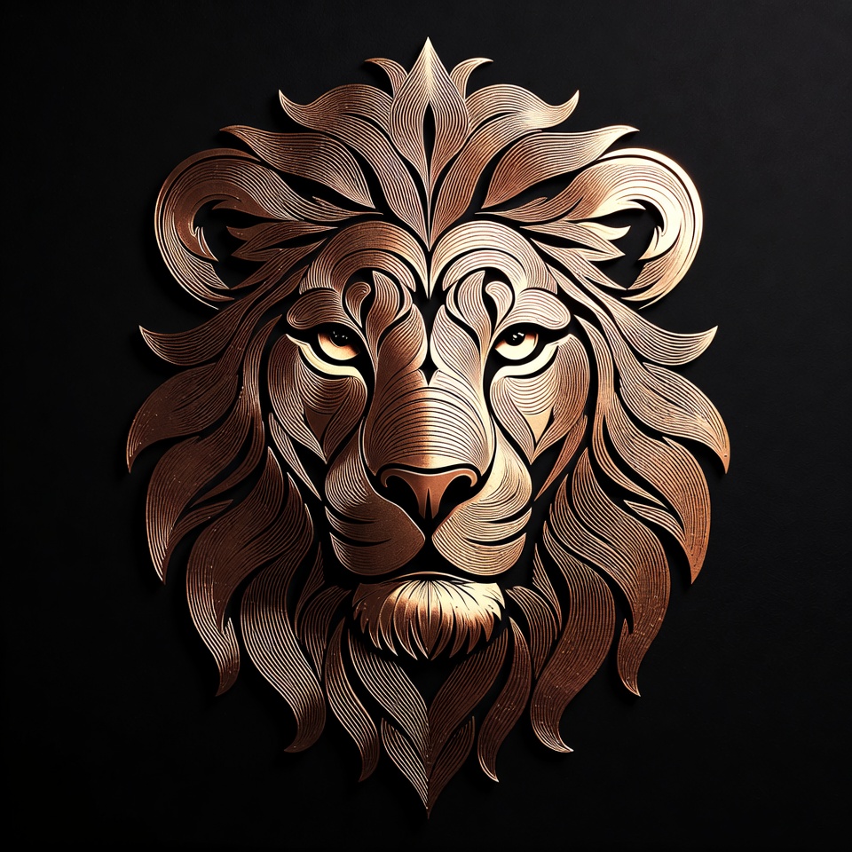 A detailed design of a lion's head made from metal. The lion's features are highlighted with intricate lines and patterns.
