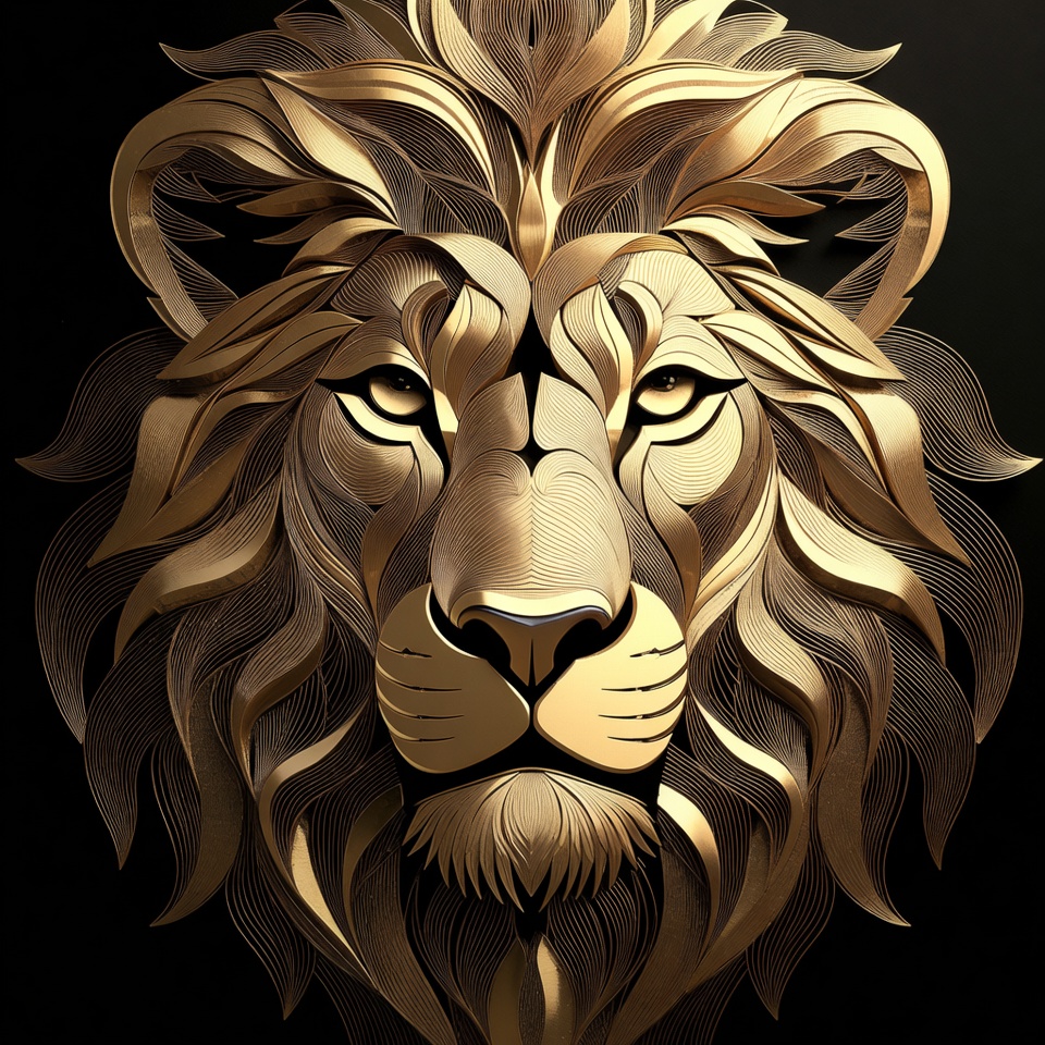 Detailed artwork shows a lion head made from layered golden materials. It features a strong face and intricate lines and shapes.