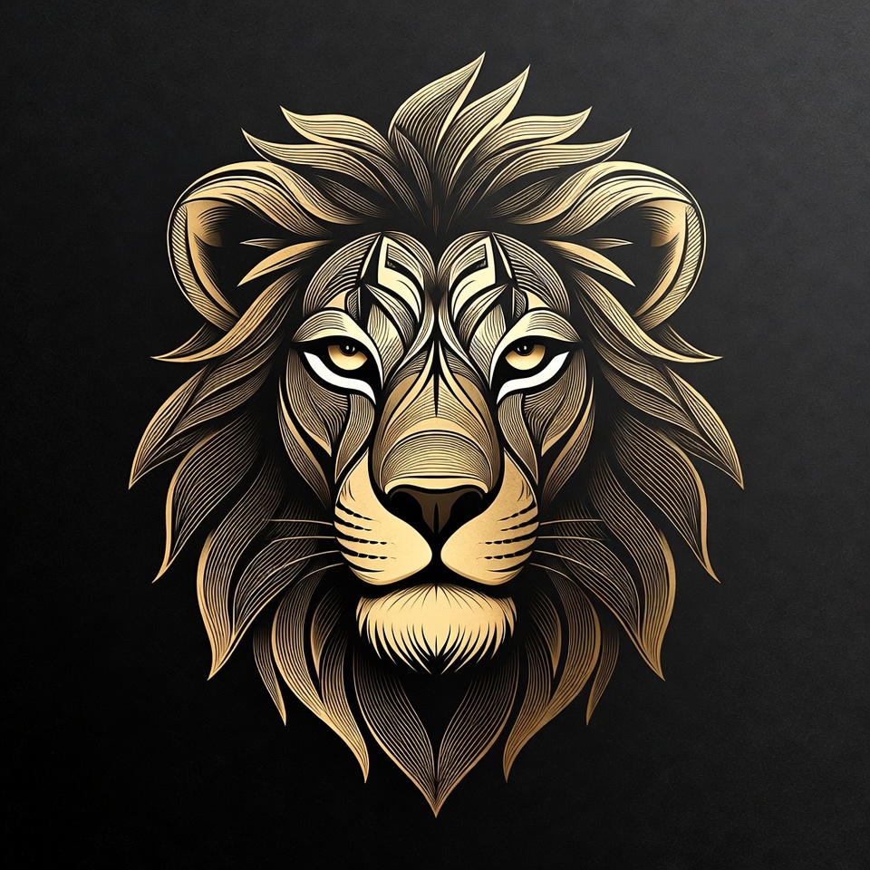 A lion head design features detailed lines and textures. The artwork showcases a golden color scheme against a dark background.