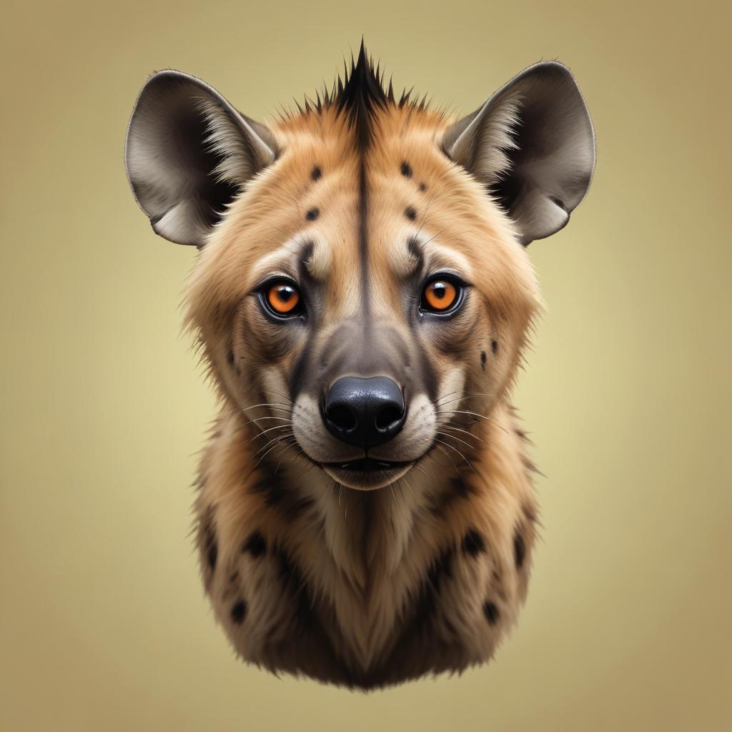 A hyena's head with distinct features like fur patterns and eye color is shown against a beige background, highlighting its unique traits.