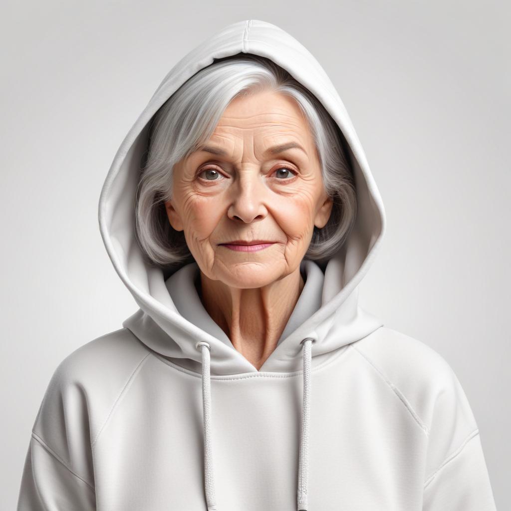 active lifestyle, aged individual, casual clothing, casual style, close-up, comfortable clothing, contrast, elderly woman, everyday wear, expression, front view, gray hair, hooded sweatshirt, light background, modern fashion, natural look, portrait, senior citizen, simple style, smiling