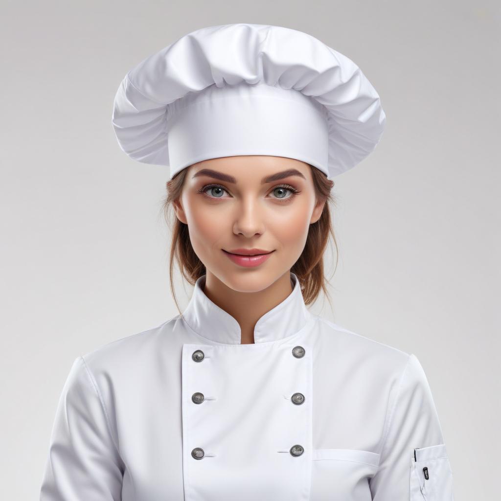 A chef stands smiling in a clean kitchen. They wear a white uniform and a tall chef hat. The background is neutral and simple.
