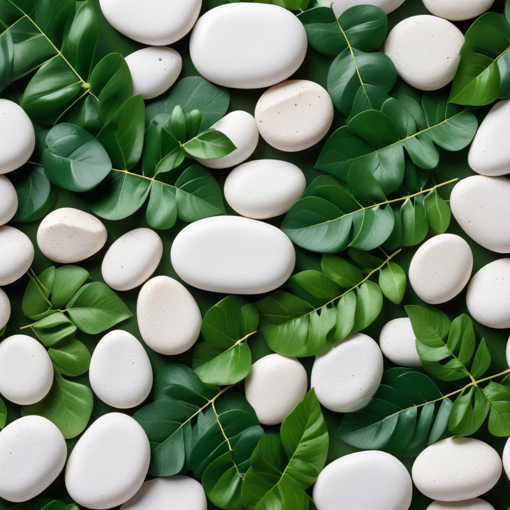 White stones and green leaves are arranged together on a flat surface. The mix comprises various sizes and shapes.