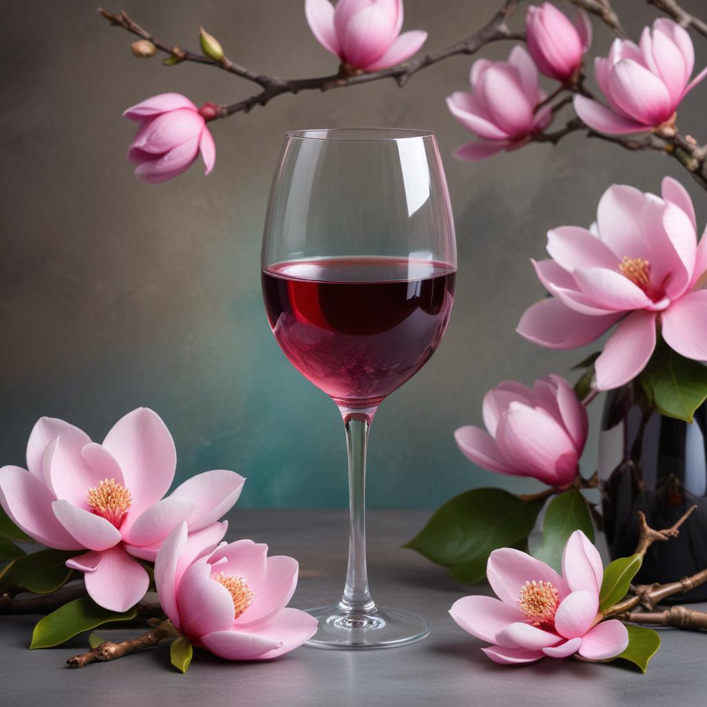 A glass filled with red wine stands beside pink flowers and branches, adding beauty to the scene in soft lighting.