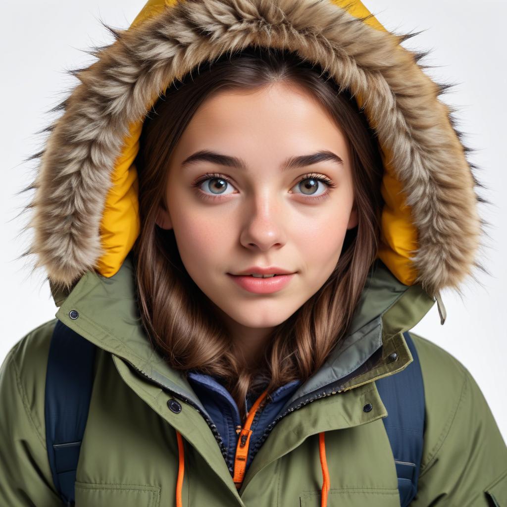 backpack, bright setting, casual wear, coat, cold weather, day, expression, fashion, features, fur hood, nature, outdoors, portrait, smiling, style, warmth, winter, winter attire, young person, youth